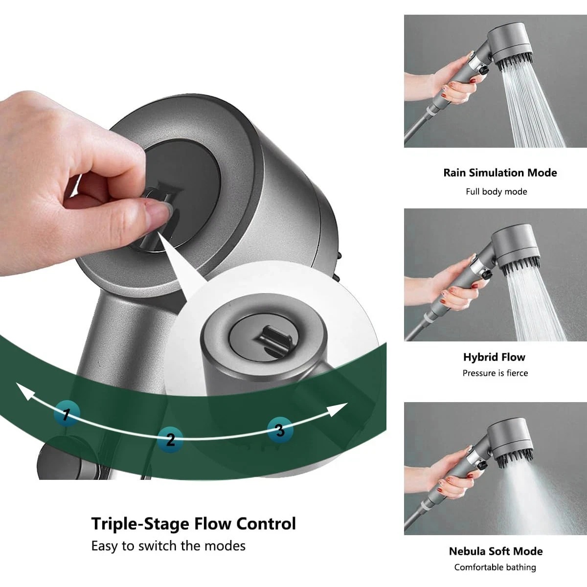 Various Spray Patterns: Choose from a variety of spray patterns, including a gentle rain mode that simulates natural rainfall, a massage mode for deep muscle relaxation, and a mist mode that creates a delicate mist atmosphere. Customize the water flow to your liking, making your shower experience varied and enjoyable.